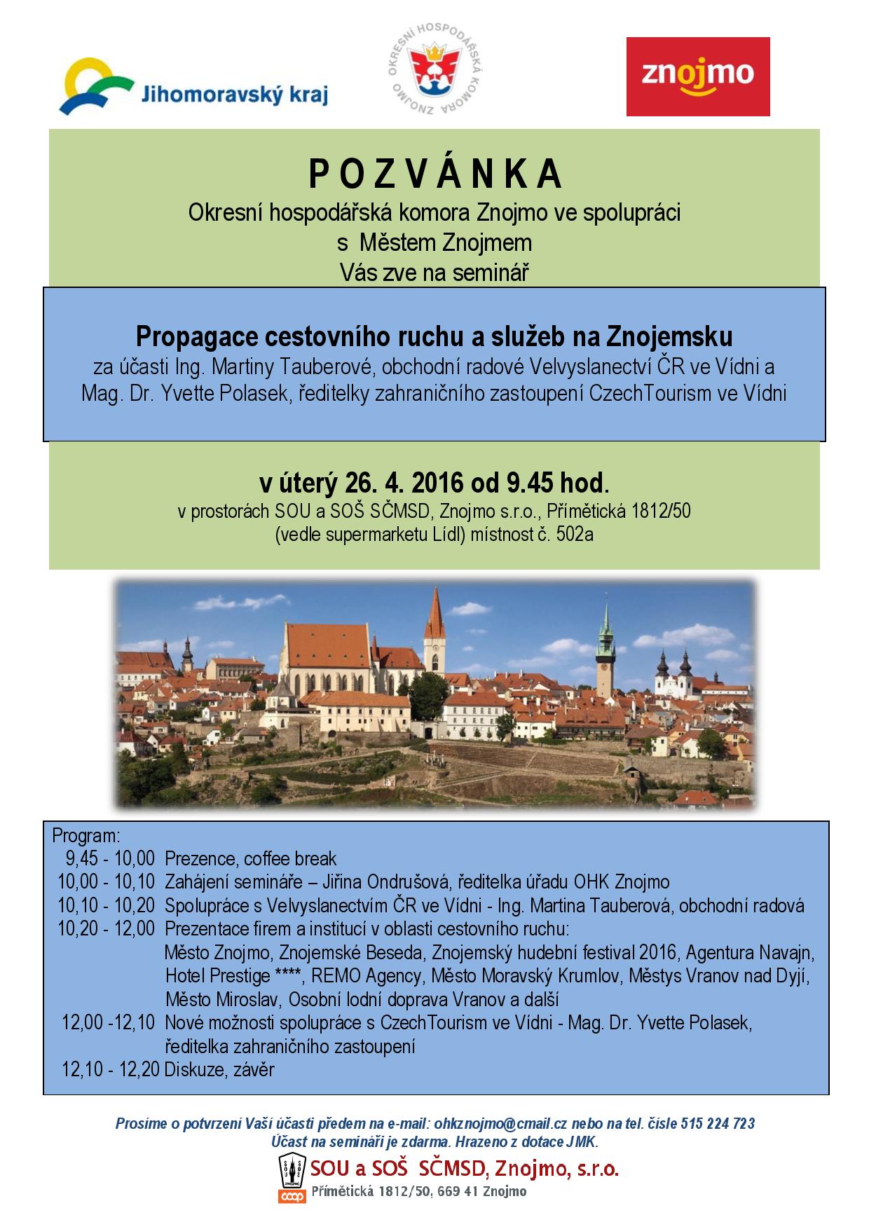 Pozvání na seminář Propagace cestovního ruchu a služeb na Znojemsku dne 26.4.2016